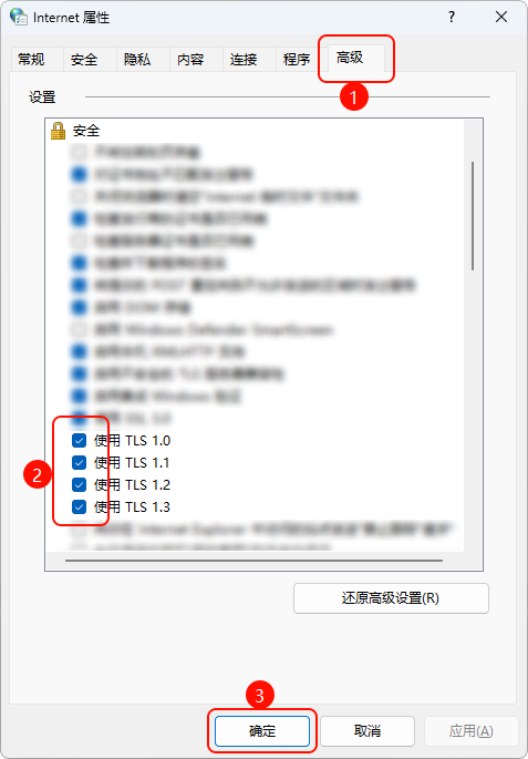 【Windows】Internet 属性——使用 TLS 2025-9-16 17:24 | 1,666 | 0 | Windows 49 字 | 几秒读完 1. 第1步:打开「Internet 属性」 运行(快捷键:Win+R) → 输入(或复制粘贴)“inetcpl.cpl” → 回车。 2. 第2步:勾选「使用 TLS x.x」 赞赏