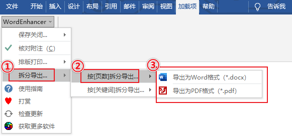 (1)Word → 加载项 → WordEnhancer → 拆分导出... → 按[页数]拆分导出...