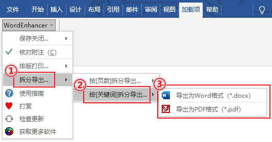 (1)Word → 加载项 → WordEnhancer → 拆分导出... → 按[关键词]拆分导出...