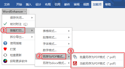 Word → 加载项 → WordEnhancer → 排版打印... → 另存为PDF格式... → 批量另存为PDF格式(*.pdf) / 当前另存为PDF格式(*.pdf)