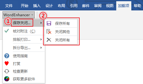 Word→ 加载项 → WordEnhancer → 保存关闭… → 保存所有/关闭其他/关闭所有