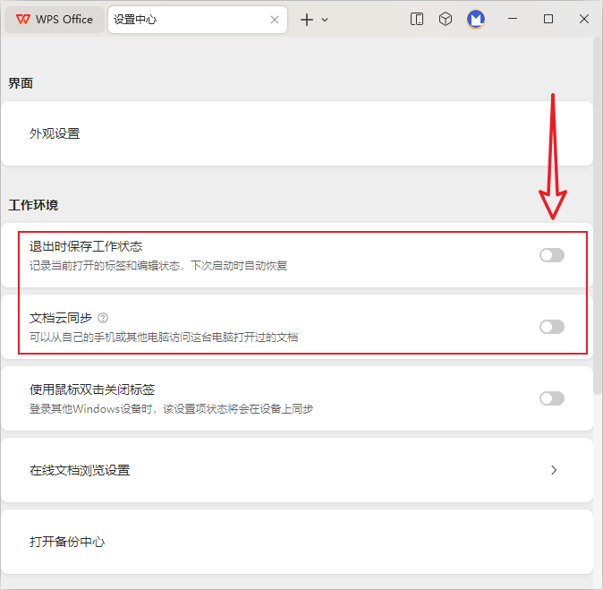 工作环境 → 关闭 退出时保存工作状态 → 关闭 文档云同步。