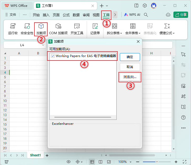 在WPS中新建一个WPS表格 → 工具 → 加载项 → 浏览 → 定位到C:\Program Files (x86)\EAS2023\WPE → 选中 WPE For WPS表格 加载项.xlam → 打开 → 确定。