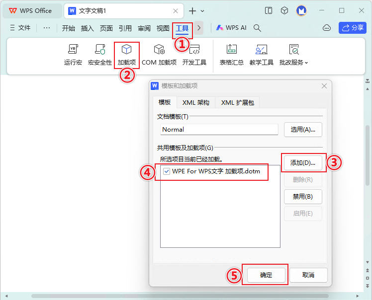 在WPS中新建一个WPS文字 → 工具 → 加载项 → 添加 → 定位到C:\Program Files (x86)\EAS2023\WPE → 选中 WPE For WPS文字 加载项.dotm → 打开 → 确定