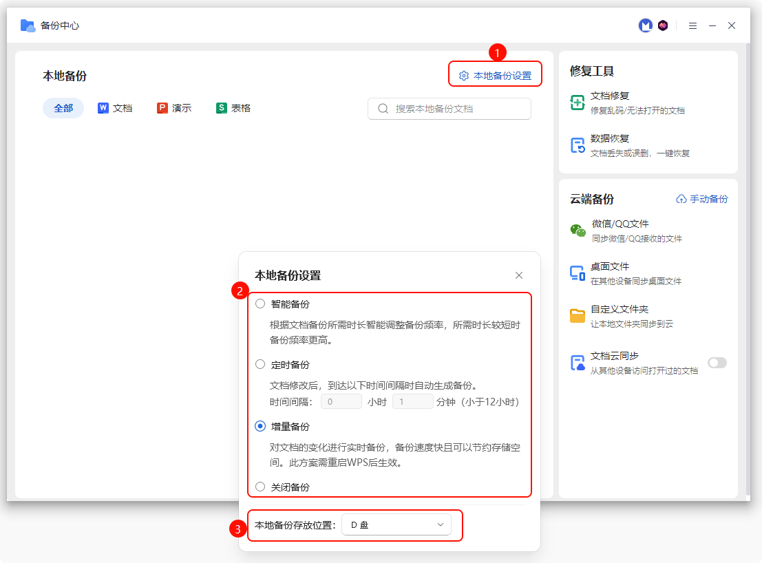 设置本地备份存放的磁盘:下拉选择需要存放的磁盘 → 关闭并重新打开一下WPS,以适用新的备份存放配置。