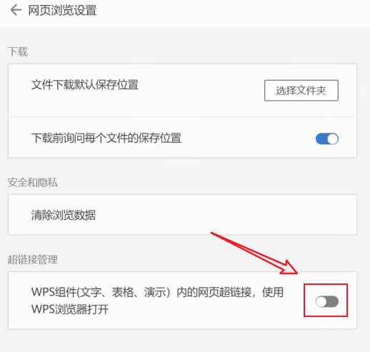 【WPS】更改网页链接默认打开方式 2023-2-19 21:22 | 4,162 | 0 | WPS 75 字 | 1 分钟内 1. 打开“设置” 2. 打开“网页浏览器设置” 3. 关闭“使用WPS浏览器打开” 4. 设置默认浏览器(可选) 推荐设置 Microsoft Edge 为默认浏览器:点击查看 注:该步骤为可选设置。 赞赏