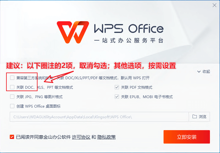 【WPS】安装提示 2023-2-19 21:22 | 3,795 | 0 | WPS 127 字 | 1 分钟内 1. 下载 点击下载 2. 安装提示 (1)自定义设置 (2)建议取消勾选以下2个项目(兼容第三方系统**,默认用 WPS 打开和关联 DOC、XLS、PPT 等文档格式),其他项目可以按需设置 (3)立即安装 3. 后续使用时 后续使用时,若WPS跳出如下界面,建议 取消勾选 相关选项后再点确定按钮。 赞赏