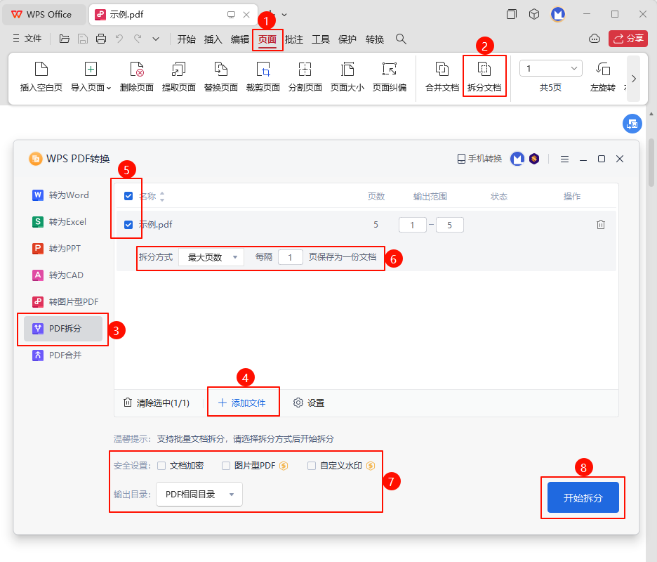 【WPS】PDF拆分 2024-5-11 20:24 | 2,389 | 0 | WPS 105 字 | 1 分钟内 1. 功能简介 把一个PDF文件分割成多个PDF文件。支持操作页面范围、拆分方式和输出目录的设置。 2. 是否收费 是。WPS会员专享。 3. 操作步骤 WPS → 页面 → 拆分文档 → (按需,添加文件) → (按需,设置输出选项,如:输出目录等) → 开始拆分。 赞赏