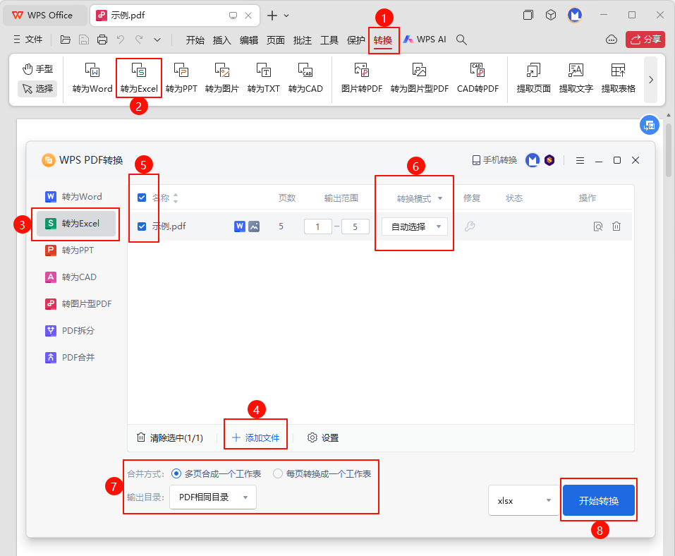 WPS → 转换 → 转为Excel → (若需,可以继续 添加文件) → 勾选需要转换的PDF文档 → 按需修改“转换模式” → 按需修改“合并方式”和“输出目录” → 开始转换。