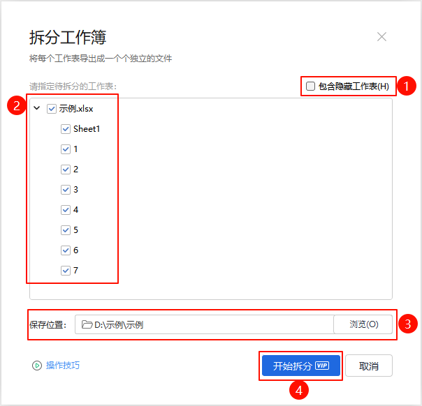 - 请指定待拆分的工作表:按需勾选;