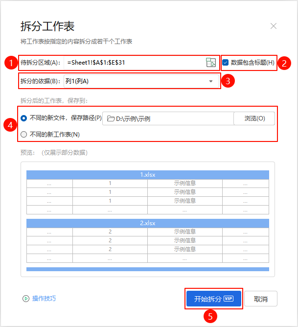 - 不同的新文件:指的是拆分后的结果另存为Excel工作簿;