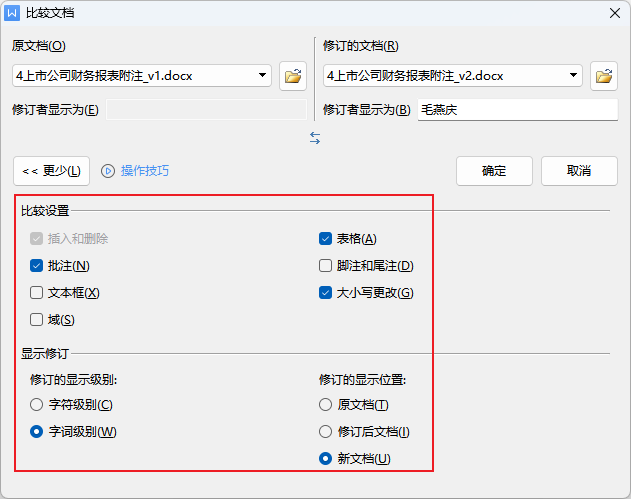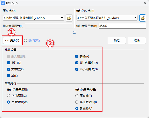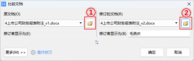 添加“原文档” → 添加“修订的文档” 。
