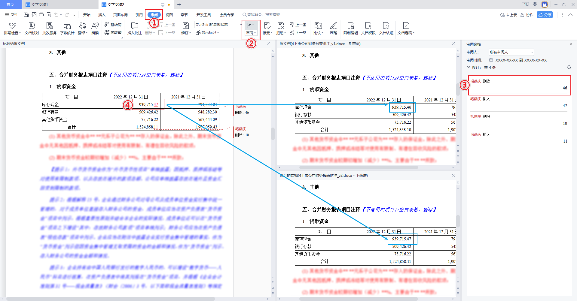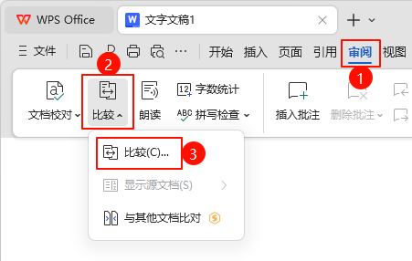WPS → 审阅 → 比较 → 比较 。