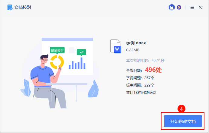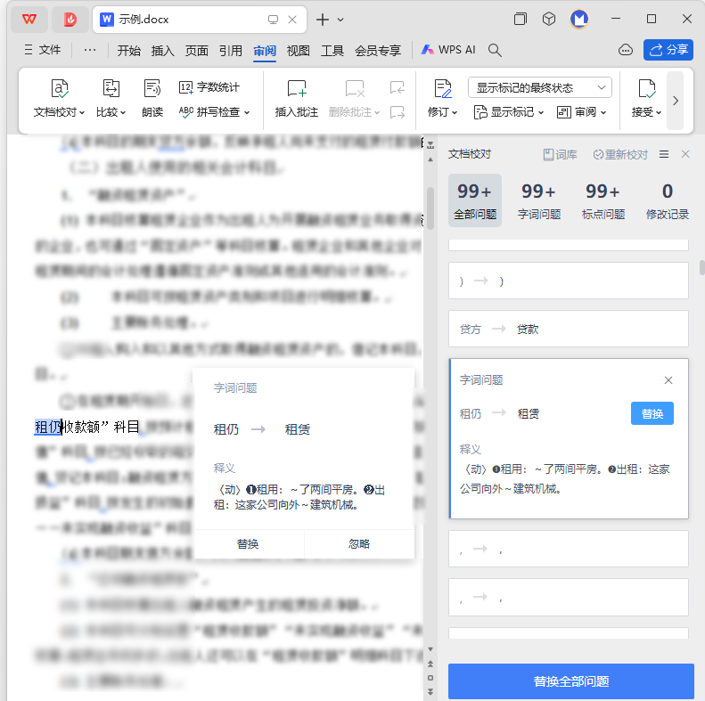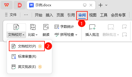 【WPS 文字】文档校对 2025-1-19 12:26 | 2,346 | 0 | WPS 123 字 | 1 分钟内 1. 功能简介 一键检测文档中存在的①字词问题、②标点问题,并提供修复建议。 2. 是否收费 收费。 WPS 的“文档校对”功能仅限会员使用。 3. 操作步骤 3.1. [第1步] 文档校对 WPS → 审阅 → 文档校对 → 文档校对。 3.2. [第2步] 立即校对 3.3. [第3步] 开始修改文档 4. 示例 赞赏