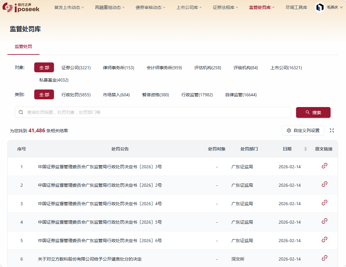 - 监管处罚库:汇总证监会、交易所行政处罚案例,支持按照处罚对象、处罚类型分类检索。