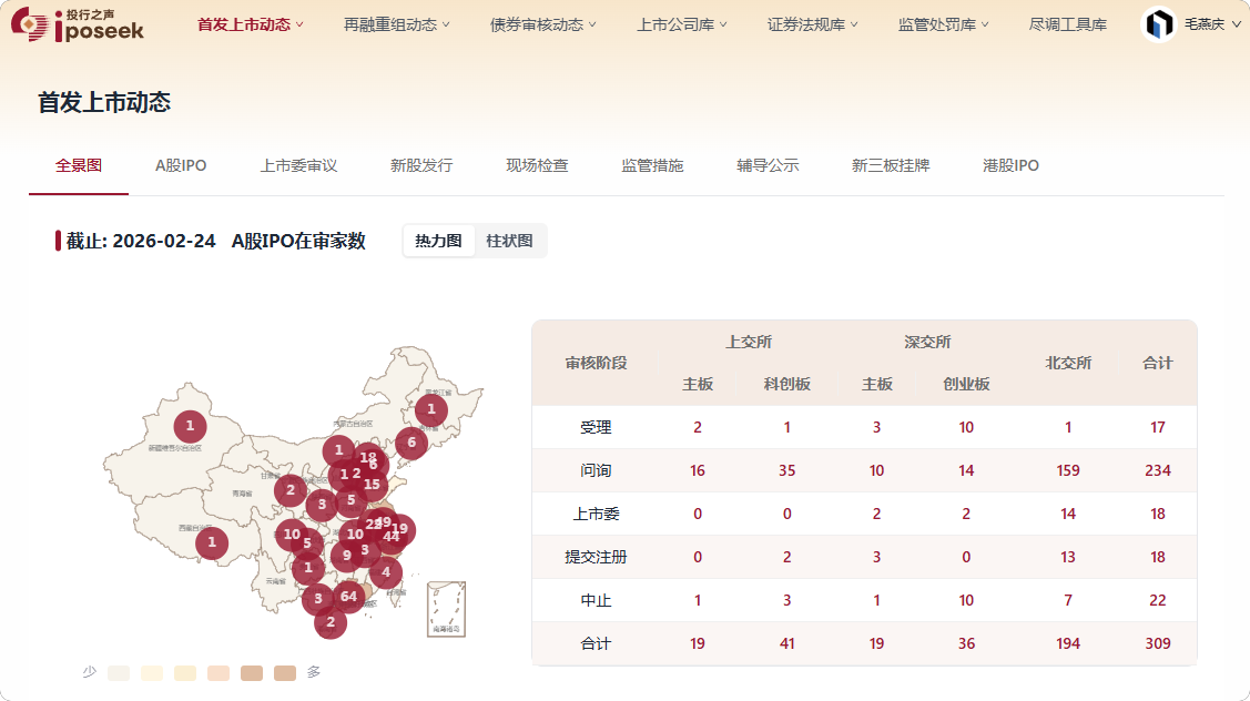 - A股IPO:实时更新沪深北交易所受理、问询、上市委审议等审核阶段数据,覆盖主板、科创板、创业板及北交所项目,提供发行人、保荐机构、中介机构等关键主体信息。
